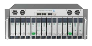 OPTOPUS ofrece una amplia variedad de módulos internos y externos. En cuanto a los primeros, éstos son gestionados a través de un bus de comunicación interno, mientras que los módulos externos- como los transmisores de modulación externa de alta linealidad o los EDFAs de alta potencia, se conectan y controlan a través de los puertos Ethernet secundarios de la unidad de gestión del sistema.